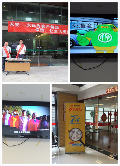 在职场摆放宣传展板,播放歌曲“保险让生活更美好”以及阿保系列动画