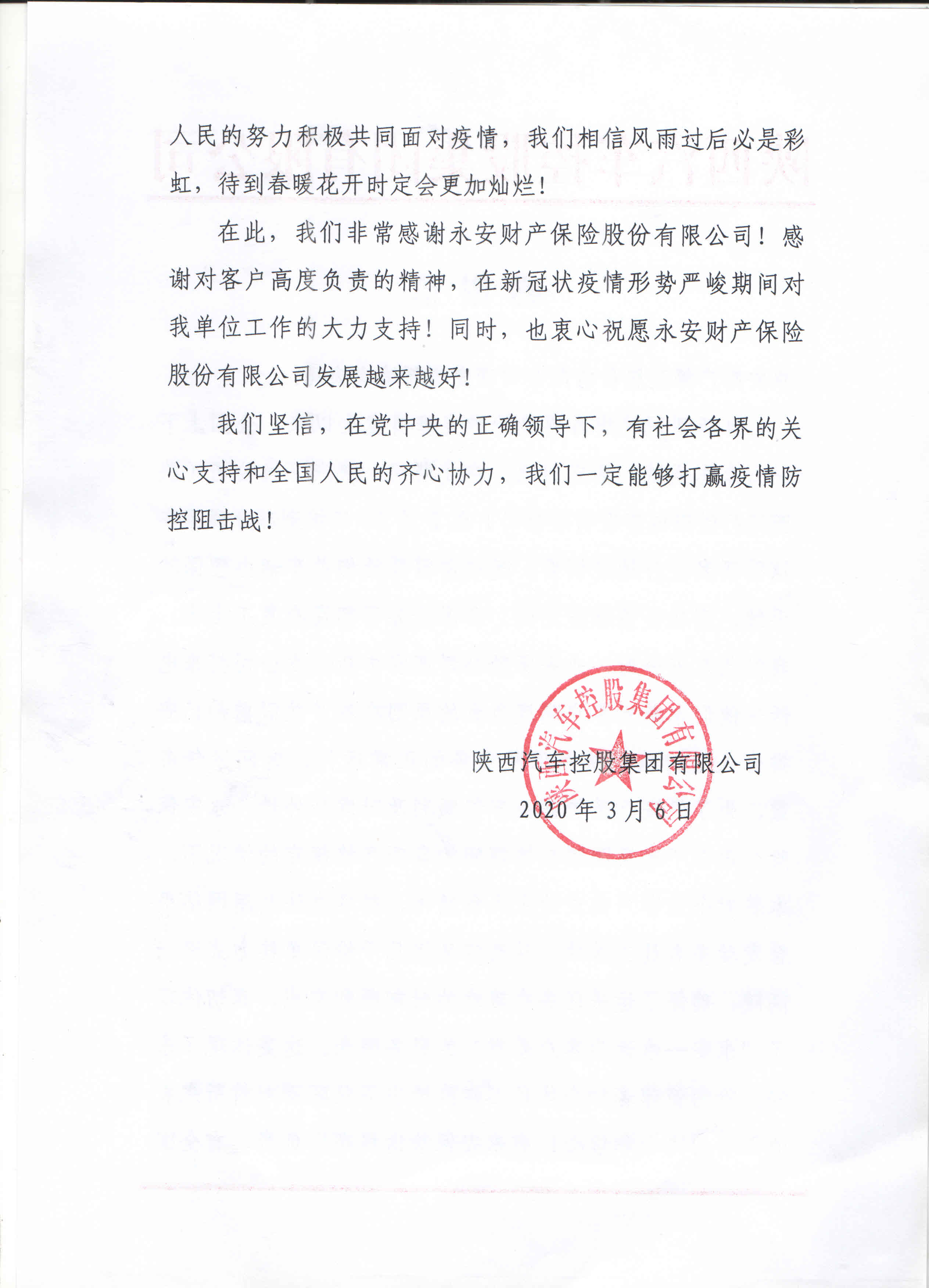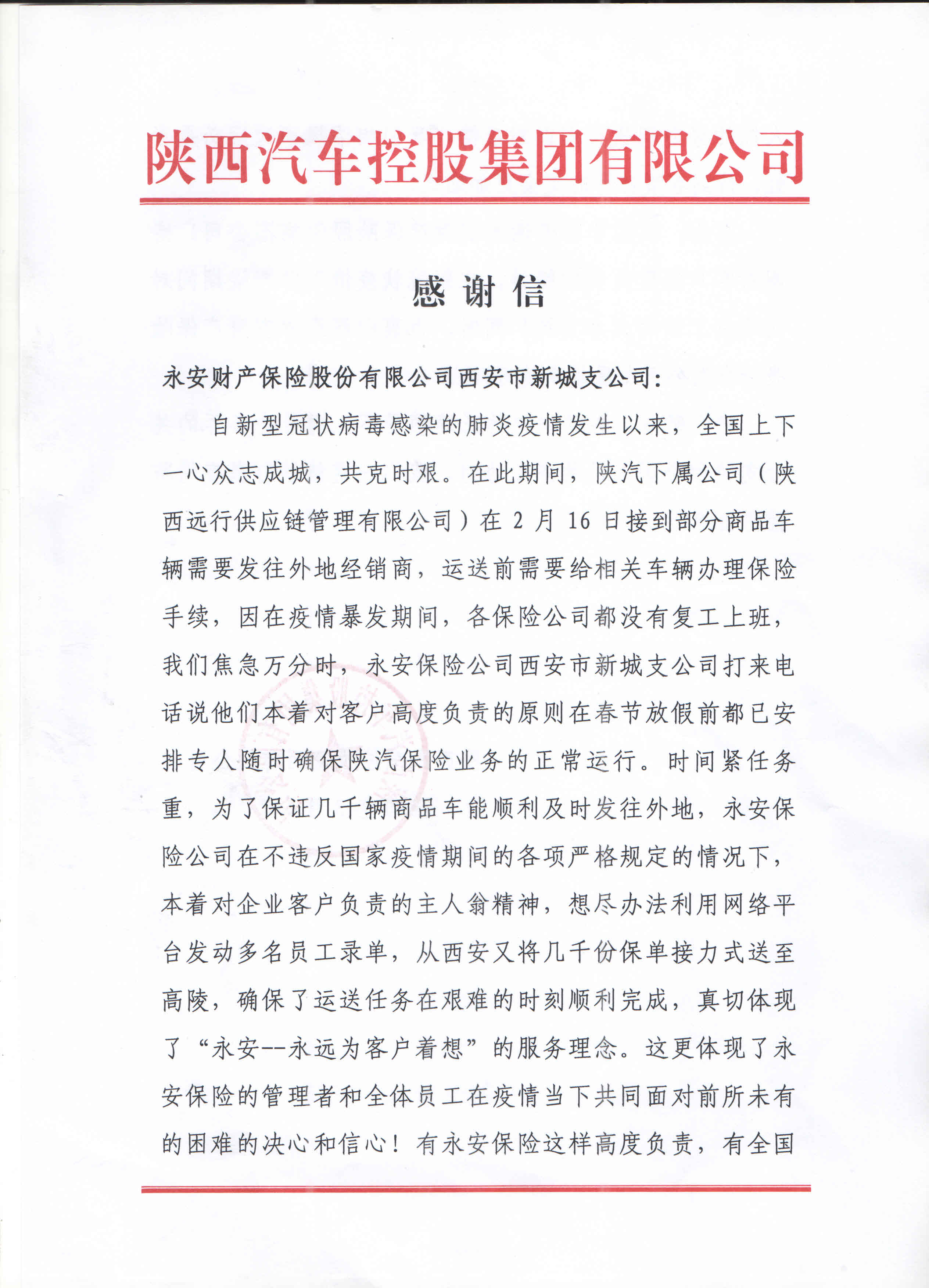 这是一次的贴心安排。新城支公司始终以客户实际需求为先,尽全力做好服务,在维护客户方面想办法、出实招,因承担了另外两家的出单任务,及时向上级分公司申领保单,在疫情期间克服各种困难将几千份保单接力式地送往陕汽集团高陵总部,安排人员无缝对接车辆运送工作。专业、高效、共赢,再次用行动证明永安保险为客户提供优质产品与服务的能力与实力。这是一份责任,也是一份担当。这样的真情服务赢得陕汽集团的赞誉,3月6日,陕汽集团总部向新城支公司发来感谢信。