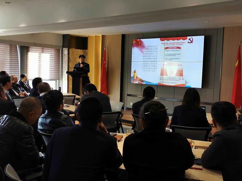 云南分公司党总支书记叶园军详细解读了《中共中央关于坚持和完善中国特色社会主义制度推进国家治理体系和治理能力现代化若干重大问题的决定》等重点内容,阐释了《决定》对决胜全面建成小康社会、全面建设社会主义现代化国家,对巩固党的执政地位、确保党和国家长治久安的重大而深远的意义。会上要求全体党员干部,一是要加强理论学习,精心组织、统筹安排,要迅速掀起学习宣传贯彻十九届四中全会精神的热潮,将党建学习切实融入到实际工作;二是要把思想和行动统一至党中央、公司党委工作部署上来,全面推动主题教育往深里走、往心里走、往实里走,积极为公司创造效益;三是要全面提升治理能力,切实强加意识形态领域管理和引导,维护制度权威,强化监督,为公司健康发展保驾护航;四是要坚持党建与业务同向同心,坚决杜绝“两张皮”现象,狠抓经营管理,推进结构调整、渠道建设、理赔服务等,全面提升竞争实力。