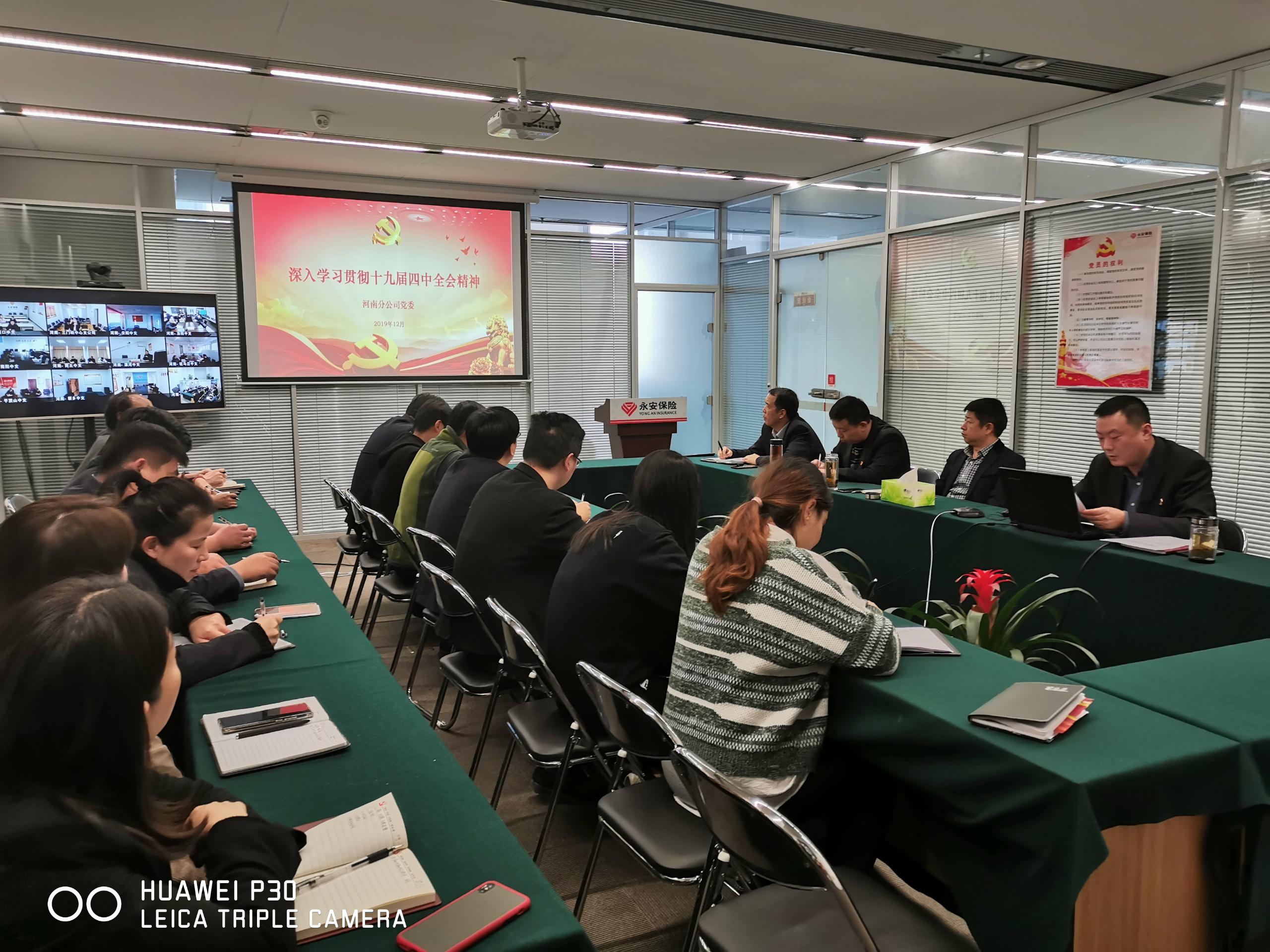 2019年12月3日,河南分公司党委组织召开了深入学习贯彻党的十九届四中全会精神宣讲报告会。分公司党委委员、部门中层以上人员、机关党支部全体党员、入党积极分子、各党支部全体党员等100余人现场或视频参加了报告会。