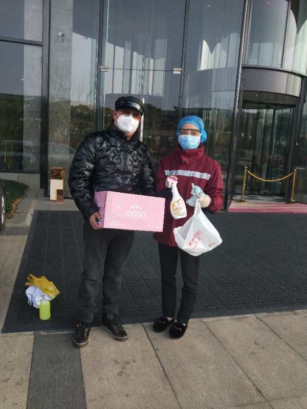 援鄂医疗队医护人员张英2月22日提出需要3个不同型号的喷壶,武汉地区“物资采购组”当天便奔波在武汉市多家大型超市之间,一家没有就立即到下一家,但却遍寻无果。考虑到是疫情一线医护人员的需要,作为武汉援鄂医疗队服务保障工作小组的副组长朱锋积极想办法,在与医疗队沟通后,提出变通解决办法,在家中找到具有喷洒功能的衣领净、清洁剂等日常生活用品,把其中的液体倒掉后,就成了现成的喷壶。2月23日,朱锋驱车50多公里将准备好的“自制喷壶”成功送至医护人员张英的手中,并额外为其送去一箱依云矿泉水。看到送来的“简易喷壶”和矿泉水,医护人员张英连忙表示非常感谢并主动要求与他合影留念。