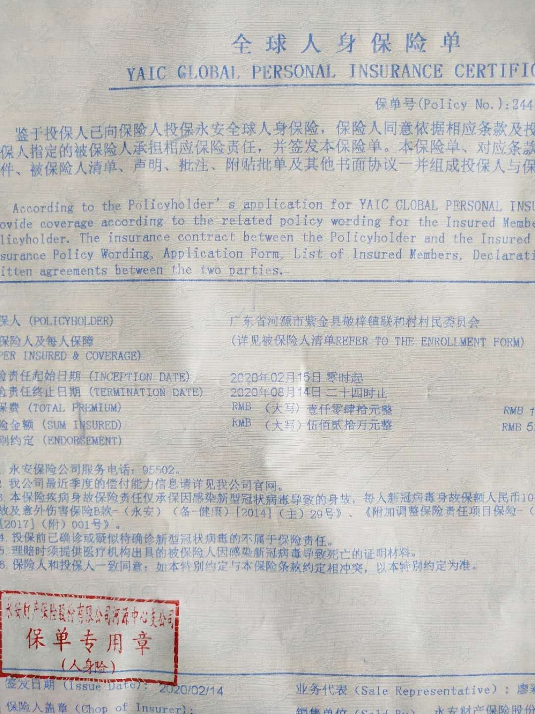 2月15日,广东分公司河源中心支公司向河源市紫金县敬梓镇联合村村委会捐赠新冠肺炎公益保险产品,保险保障达520万元,有力地支持了河梅交界乡镇抗疫一线的52名工作人员。