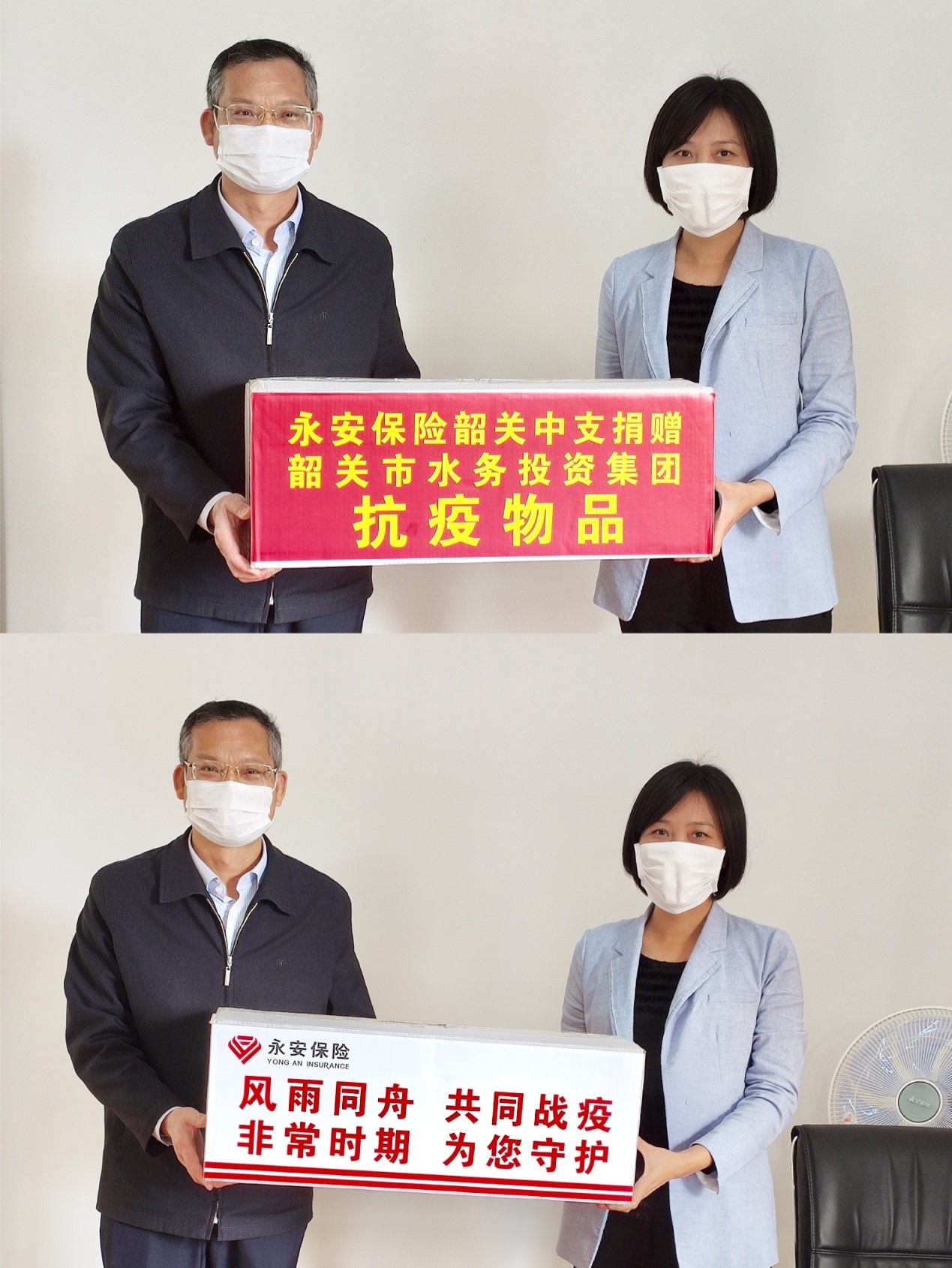 2月23日,广东分公司韶关中心支公司得知韶关市供水一线人员抗疫物品紧缺后,立即通过多渠道筹集。短短两天时间,为一直坚守一线的供水人员共募得500个一次性防护口罩。