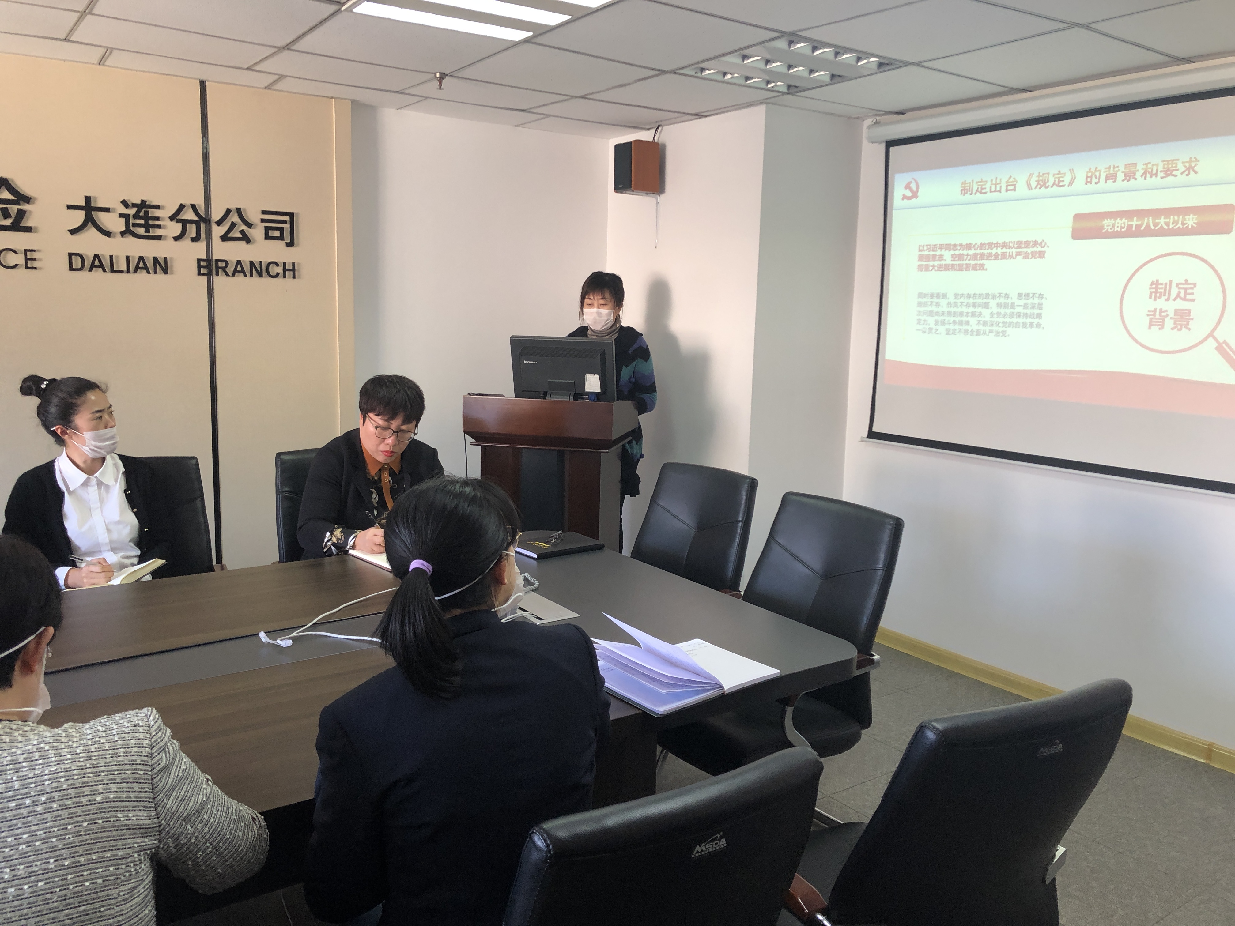 分公司党总支委员唐少静从内容基本情况、出台背景和要求、内容逐条解读、如何落实全面从严治党主体责任四个方面带领大家共同进行了全面学习,使大家牢牢把握关于全面从严治党的最新精神,明确了新目标。通过学习进一步深化了分公司全体党员干部的思想认识,提高了政治站位。