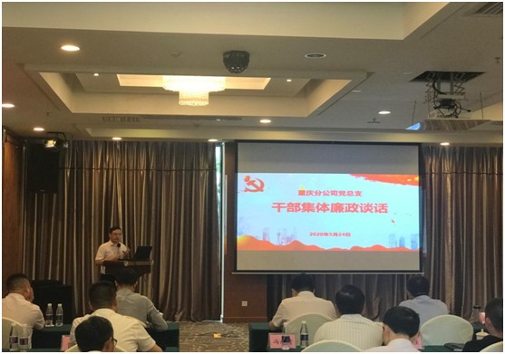 随后,党总支纪检委员范小林同志主持开展了干部集中廉政谈话。他从深刻认识“党管干部”的内涵,强调干部必须切实增强“四个意识”,自觉服从和维护党中央和党组织的统一领导和管理;从切实履行“一岗双责”主体责任,强调干部既要履行本部门的经营管理责任,又要履行本单位员工思想政治工作、党风廉政建设和反腐败工作责任,要做到反腐倡廉、案件防范工作与业务工作“同研究、同规划、同布置、同检查、同考核、同问责”,“两手抓、两手硬”;从深入贯彻落实中央“八项规定”,持久纠治“四风”,结合分公司具体实际重点提醒干部在“六个方面”要加强自我约束和管控;从纪检监察政治监督、廉政约谈、日常监督和查处案件工作内容和要求,强调干部要自觉接受纪检监督。