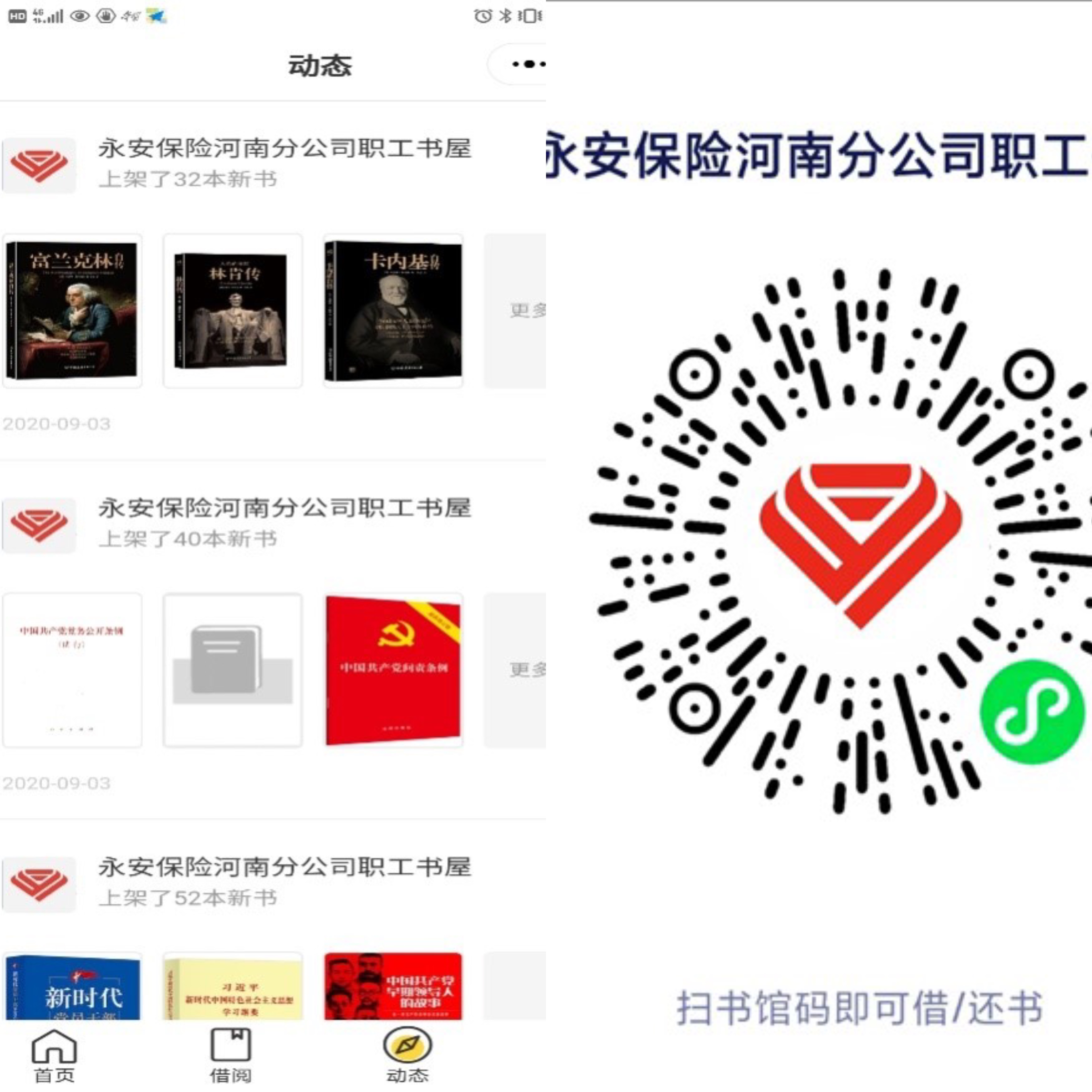 为把职工书屋建设成为共享共用的“知识库”,分公司联合互联网信息科技公司共同研发“永安保险河南分公司职工书屋图书借阅小程序”,将职工书屋打造成一个线上智慧图书馆。职工通过“借阅小程序”可以手机扫描二维码来进行图书的管理、借阅等功能,真正意义上实现书馆创建、书籍管理和线上传播一体化的功能。此外,职工还可以在书馆中发表书评,进行讨论,充分营造一个浓厚的学习氛围,真正将职工书屋打造成为吸引员工的“精品屋”。