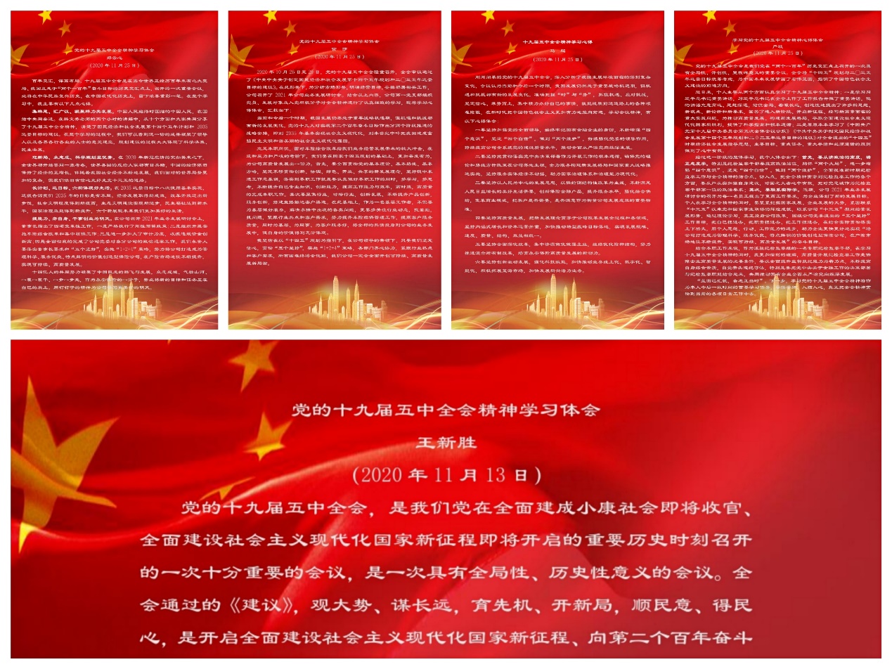 本次主题党日活动组织观看了中央宣讲团关于党的十九届五中全会精神首场报告会,集中学习了公司2021年业务研讨会议提出的“五个坚持”、“1+2+4”策略以及党委书记、董事长陶光强同志重要讲话精神,支部17名同志紧密结合工作实际,分别撰写了个人学习心得。为了便于交流学习,相互促进提升,支部将评选出的5篇优秀心得以及全体党员的心得摘要同时发布到支部微信群,进一步督促全体党员学思践悟、实干笃