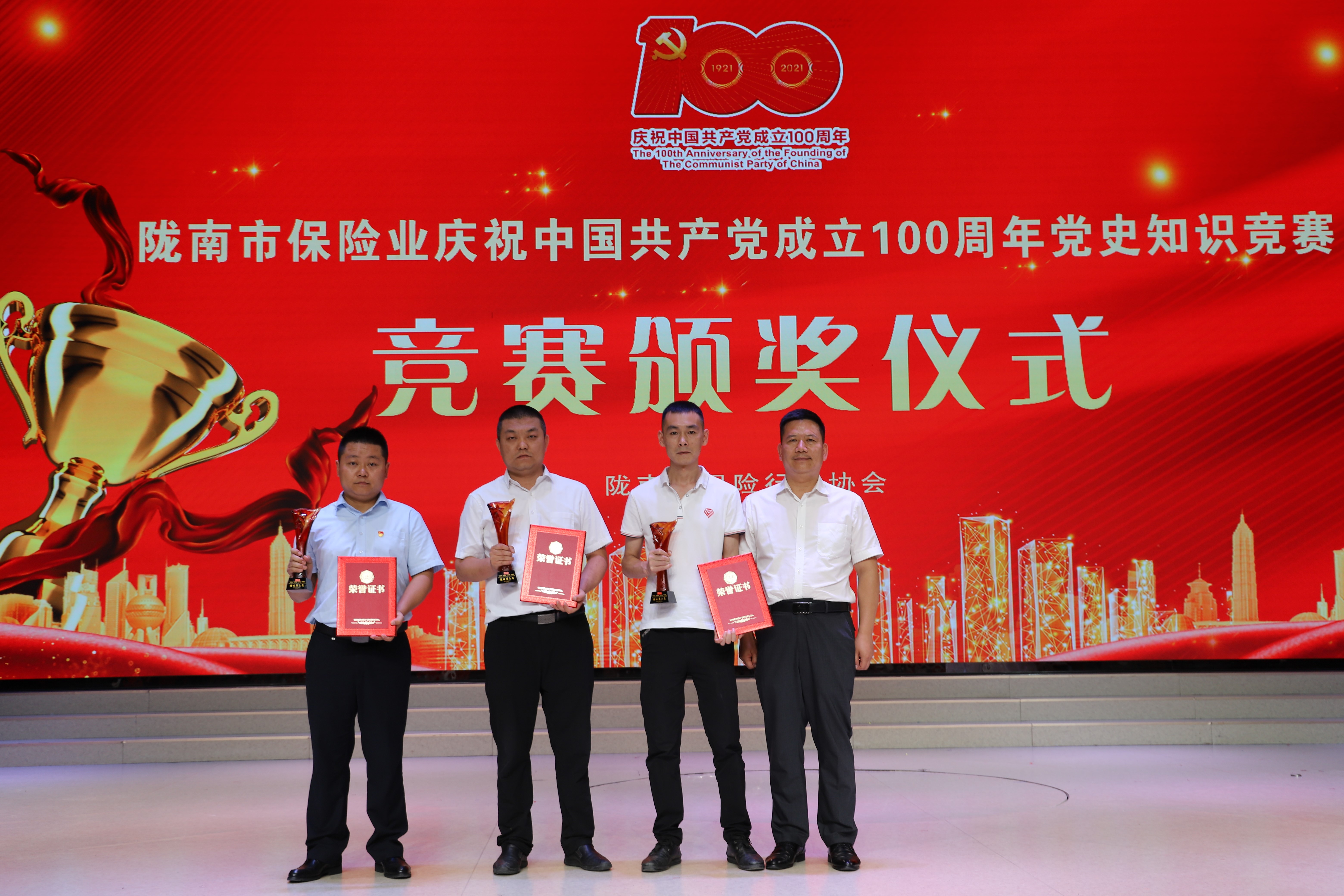 为庆祝中国共产党成立100周年,深入学习贯彻落实习近平总书记关于学习党史的重要讲话和指示精神,推动陇南市保险业将党史学习教育走深走实,6月15日,由陇南银保监分局指导,陇南市保险行业协会主办的陇南市保险业庆祝中国共产党成立100周年党史知识竞赛活动在陇南市电视台演播大厅隆重举办,陇南市21家保险主体组建的18支代表队参加了竞赛。 经过复赛和决赛两轮激烈角逐,陇南中心支公司代表队准备充分、功底扎实,最终获得本次党史知识竞赛团体三等奖的好成绩。