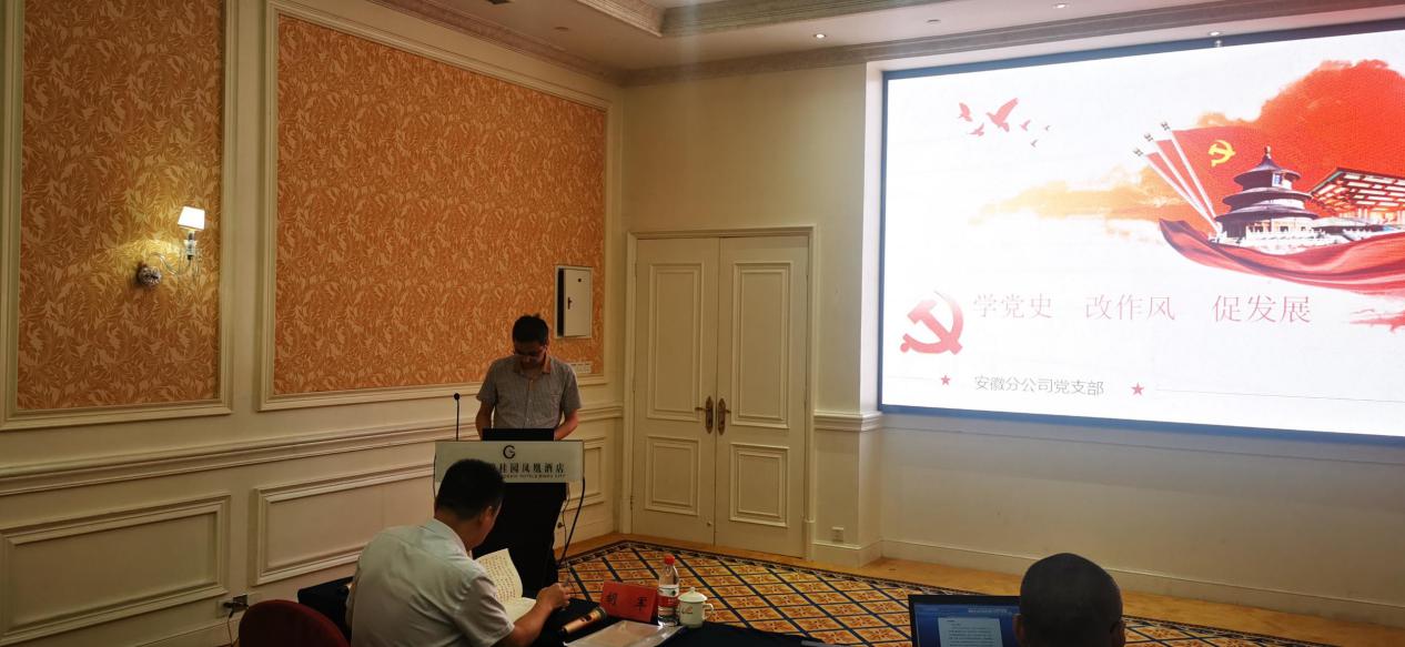 分公司党支部书记王磊作了“学党史、改作风、促发展”的党建主题报告。他强调,分公司全体党员干部以习近平新时代中国特色社会主义思想为指导,增强“四个意识”,坚定“四个自信”,加强党的建设,驰而不息纠正“四风”问题,深入推进反腐败工作,在坚持中深化,在深化中发展,不断增强党的创造力、凝聚力、战斗力。为安徽分公司可持续发展贡献力量。