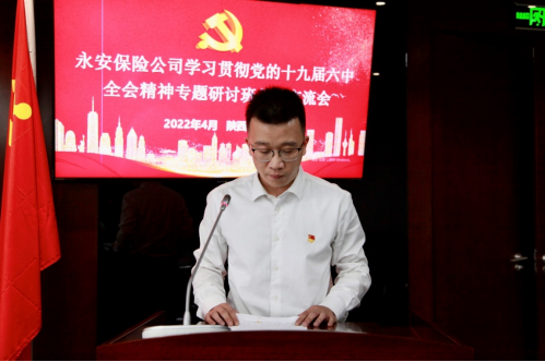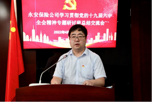 公司党委副书记、副总裁(主持经营工作)刘雄从深入学习领会习近平总书记重要讲话和《决议》的丰富内涵和精神实质、深刻认识党的十九届六中全会及成果的重要意义、准确把握党的十九届六中全会精神的丰富内涵、成果要义,持续掀起学习宣传贯彻党的十九届六中全会精神的热潮四个方面分享了自己的学习心得,并要求公司各级党员干部要以学习贯彻党的十九届六中全会精神为契机,在省委、省政府和上级党组织的坚强领导下,大力弘扬伟大建党精神,埋头苦干、奋勇争先,着力在学思践悟中不断坚定信仰、启迪智慧、汲取力量,奋力谱写永安保险公司高质量发展新篇章。