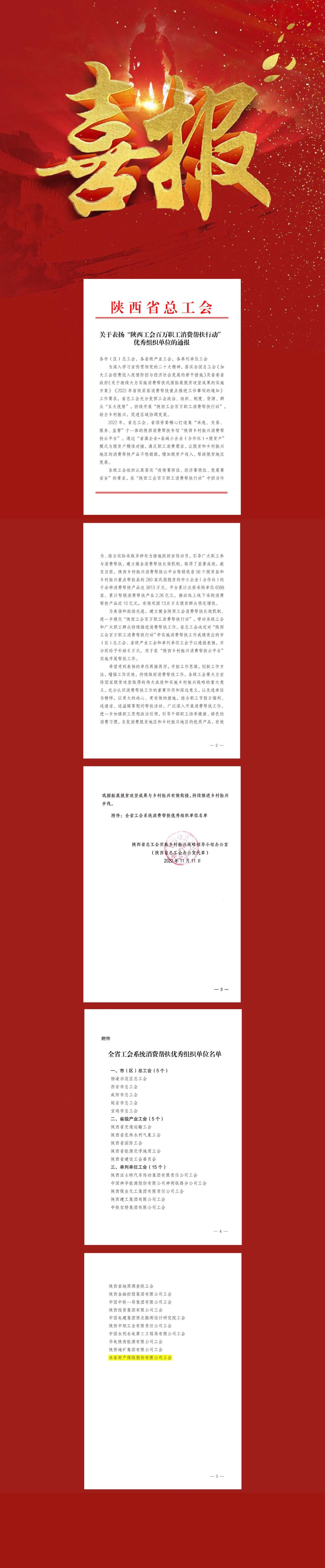 2022年,公司工会学习宣传贯彻党的二十大精神,认真落实习总书记重要讲话精神、工人阶级和工会工作的重要指示精神,围绕公司中心工作,充分发挥工会政治、组织、制度、资源、群众“五大优势”,持续开展“陕西工会百万职工消费帮扶行动”,在宣传动员、建立长效机制方面做了大量工作,通过“以购代捐”“以买代帮”等方式,助力乡村振兴,取得了显著成效。获得本次荣誉,是省总工会对公司工会消费帮扶工作的充分肯定,也是对今后工作的鞭策。