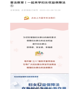 为进一步深入学习贯彻党的二十大精神,引导广大女职工学法守法用法增强妇女群众的法律意识,智慧“永安”花区通过发放电子读书卡自主学习党的二十大精神、发放妇女权益法规读本及企业公众号连载专题学习《中华人民共和国妇女权益保障法》微课及参与答题环节,开启线上学习竞答体验,女神们纷纷化身“最强大脑”,预祝顺利完成智慧打卡。
