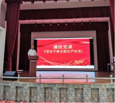 中支党支部书记杨锐斌在南阳抗大礼堂为全体党员上了一堂“坚定不移全面从严治党”廉政党课,深刻阐述廉政教育、反腐倡廉、全面从严治党的重大意义,要求每位党员务必在政治上、思想上、行动上时刻与党中央保持高度一致,自觉增强廉洁自律意识,筑牢拒腐防变思想防线。通过廉政党课学习,使全体党员进一步增强政治意识、规矩意识、廉洁自律意识,提高了思廉、践廉的自觉意识。