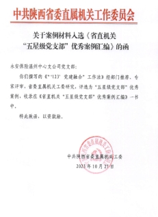 近日,中共陕西省委直属机关工委编辑印发《省直机关“五星级党支部”优秀案例汇编》,从省直机关1023个“五星级党支部”优中选优,总结了其中112个“五星级党支部”的优秀工作方法。由永安保险公司党委推荐的温州中心支公司党支部“‘123’党建融合工作法”光荣入选优秀案例。