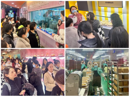 完成了自己亲手制作的蛋糕后,大家依次参观了城堡之窗、魔法厨房、蛋糕研发室等区域,了解御品轩的配料、搅拌、成型等蛋糕生产线和工艺流程,姐妹们一同近距离感受一个新鲜产品从下单到包装的完美过程。严谨有序的制作过程,透明可见的生产工序,让大家对御品轩的产品质量把控及制作工艺有了进一步认识和了解。