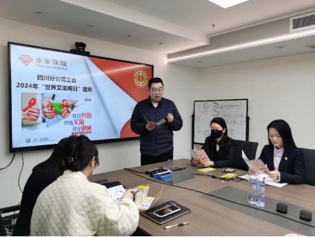 为进一步做好艾滋病防治常态化宣传工作,加强干部职工对艾滋病防治知识的了解和认识,提高工会会员健康观念和防病意识。根据陕西省总工会和永安保险公司工会的统一部署,为贯彻落实党的二十大精神,落实中国工会十八大提出的“推进职工健康服务”要求,在第37个“世界艾滋病日”来临之际,四川分公司工会联合社区及疾控中心开展“社会共治 终结艾滋 共享健康”艾滋病知识宣传活动。