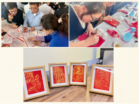 活动开始,老师详细讲解了陕西非遗的起源、发展、艺术风格、文化特点以及陕北剪纸与碑石拓印制作的全过程。大家细心聆听,充满期待。很快,剪纸以既定图案为蓝本,伴随着清脆的“咔嚓”声,一幅幅栩栩如生的作品跃然纸上。拓印环节,在老师的指导下,大家纷纷选取自己喜欢的碑石纹样,拿起工具,蘸取金墨,细致地调整角度,认真地“哒哒”捶打……经过一番精雕细琢,“平安喜乐”“万事顺遂”“如意”“长乐”等承载着美好愿望的作品脱拓而出。大家小心翼翼地将作品装裱起来,细细端详,相互品赞,拍照、合影,其乐融融,并表示,希望借助这美好的愿望,开启新征程,迎来新气象。