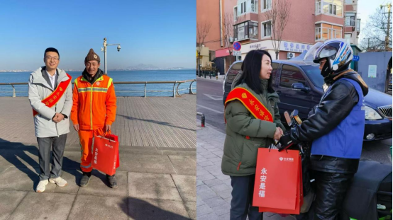 慰问中,分公司党总支先后深入二七广场和东港两处,将一份份米面油、手套等爱心物资送到了环卫工人和外卖员手中,并叮嘱他们注意身体和防寒保暖,筑牢健康安全防线。环卫工人和外卖员们纷纷表示,此次慰问不仅是一份物质上的帮助,更是对他们工作的一种认可和尊重,让大家真切感受到来自“永安”的牵挂和贴心关怀,真真切切将关怀和温暖送到了心坎上。
