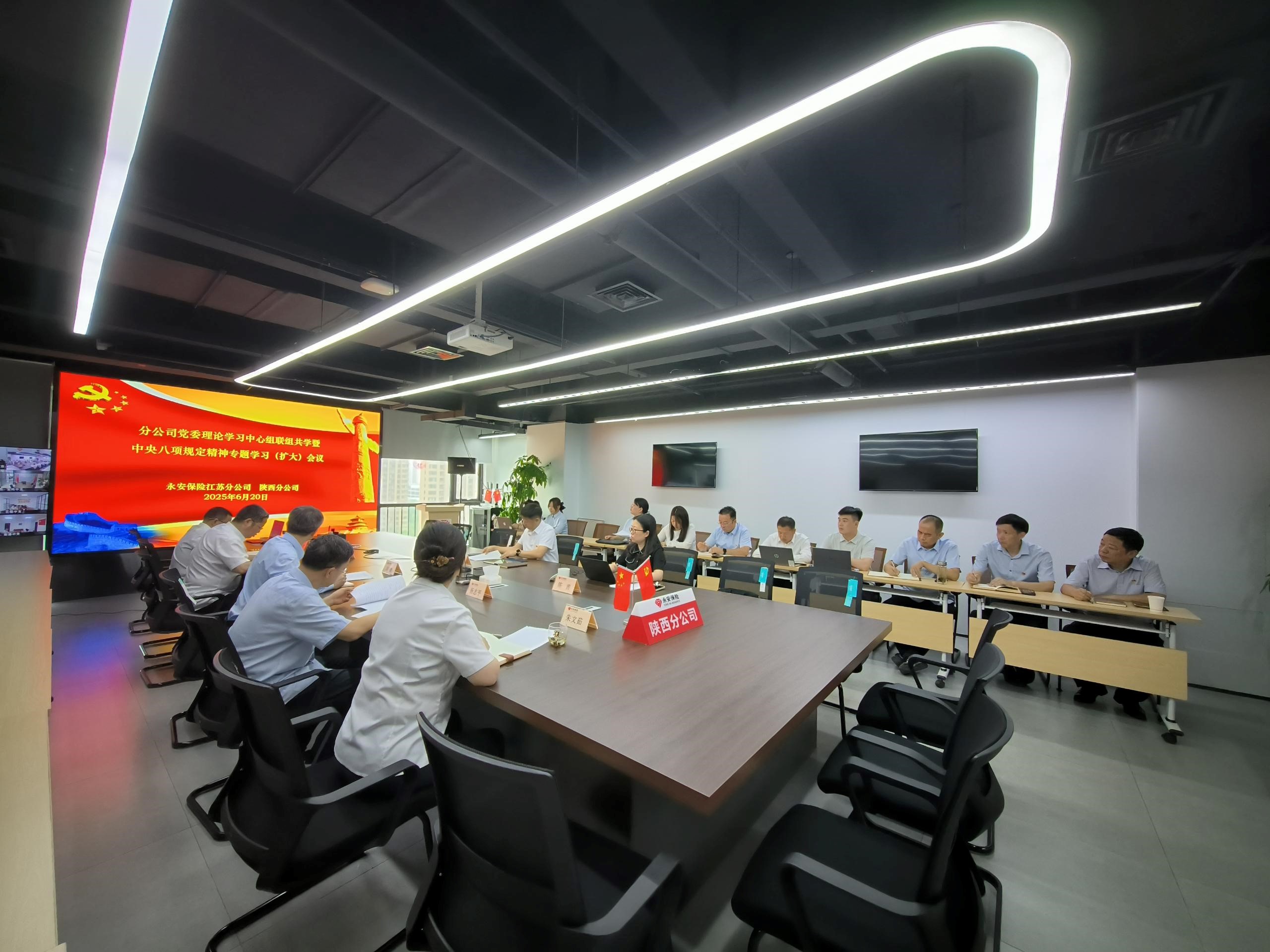 6月20日上午,陕西、江苏分公司召开党委理论学习中心组联组共学暨中央八项规定精神专题学习(扩大)会议,公司党委委员、副总经理、江苏分公司党委书记、总经理孙辉;公司党委委员、副总经理、陕西分公司党委书记、总经理胡国华巡听旁听指导会议。陕西分公司党委委员、经营班子成员、各党支部书记、各中支、各部门负责人参加学习。 与会人员共同学习了《习近平书记重要论述摘编》、习近平总书记发表重要文章《锲而不舍落实中央八项规定精神,以优良党风引领社风民风》等内容,观看系列视频《八项规定改变中国》,孙辉同志以 “学查改贯通发力,推动基层作风建设取得新成效”为题讲授党课,陕西分公司中心组成员、西安中支党支部书记围绕学习主题结合工作实际作了研讨发言。