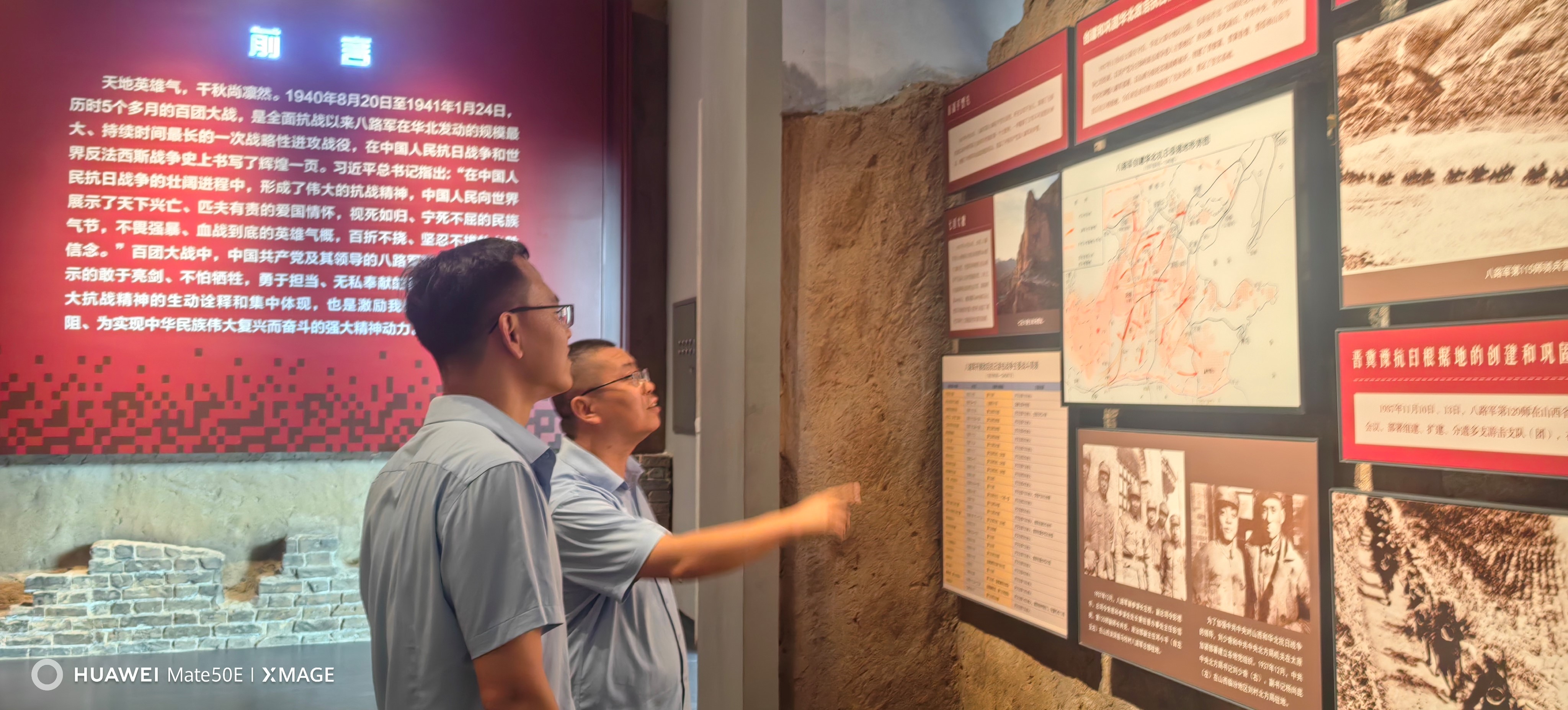在百团大战纪念馆,参学人员集体参观馆内历史图片和革命文物。大家在讲解员的解说中切身感受百团大战的“战火硝烟”,深切感悟党领导的人民军队在狮脑山的英雄壮举,于历史光影中领悟革命先辈的深沉家国情怀,汲取砥砺奋进的精神力量。